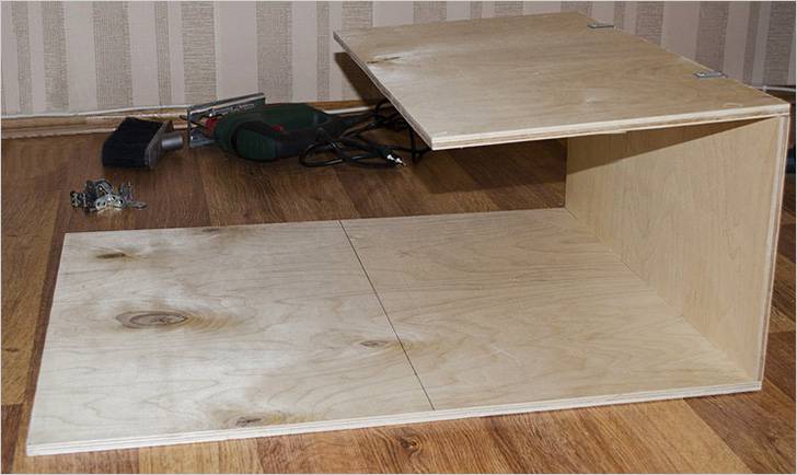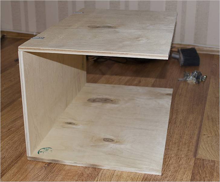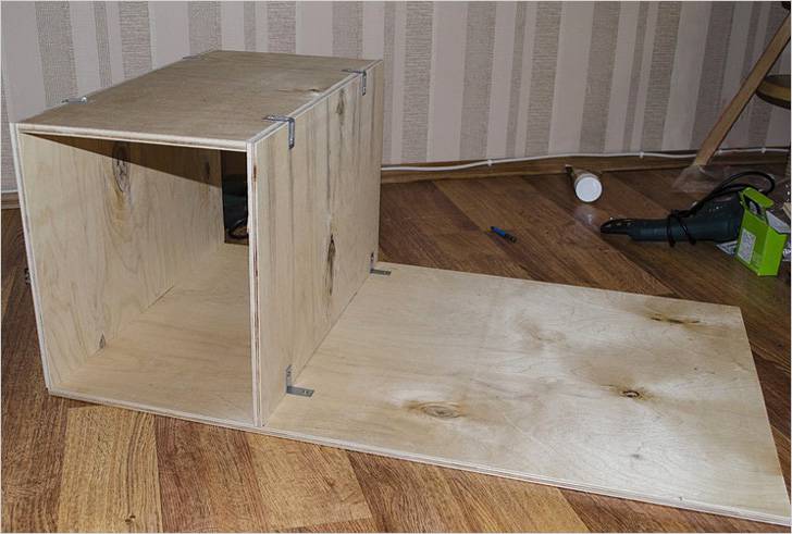 Два куска фанеры 75*50 см нарезали на 4 прямоугольника. Из них сделали крышу, пол и две боковые стенки. При изготовлении одной из полок остался кусок фанеры с полукруглым отверстием сбоку. Его решено сделать «входом», и заднюю стенку вырезали из одного из кусков. Осталось собрать домик, что совсем несложно. Были использованы маленькие металлические уголки, которые крепились короткими саморезами.