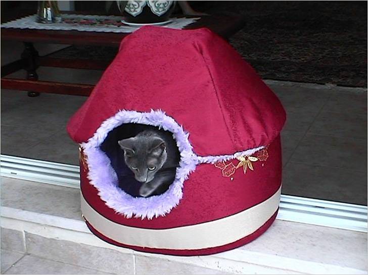 Сделать лежанку для кошки своими руками, напоминающий небольшой домик несложно. Понадобятся: флисовое полотно 1.5х1.5 м, синтепоновая прокладка 1.5х1.5 м, гибкий мощный шнур для крыши, швейные принадлежности.