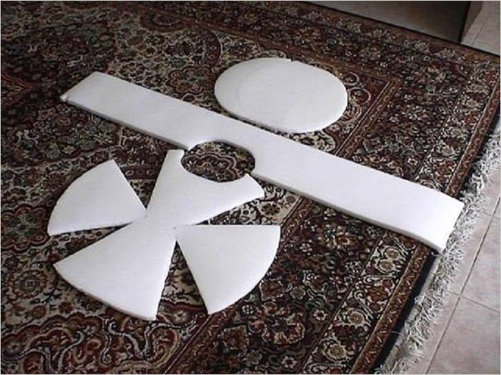 Чтобы не испортить лист дорогого поролона, лучше сделать выкройки из газет, а потом перенести очертания на материал. Вот такая получается выкройка.