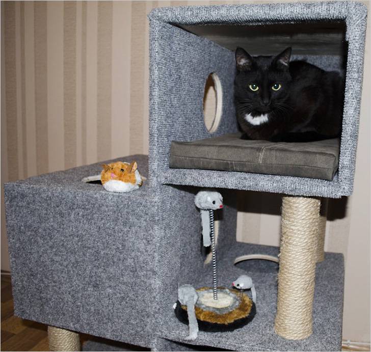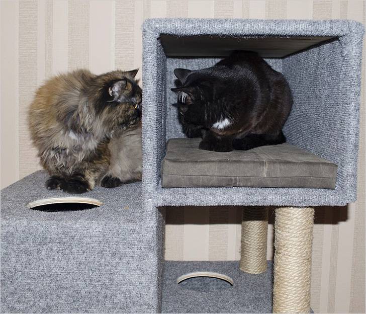 В семье есть два кота. Старший — кот-агрессор и младший, более подвижный. Поэтому конструкция была разработана так, чтобы младший мог скрыться на самой высокой платформе, а старший, из-за своего веса, туда добраться не мог. Домик решили расположить высоко, так как оба кота предпочитают высоту. По размерам сделали его побольше, чтобы оба индивида там могли находиться одновременно.