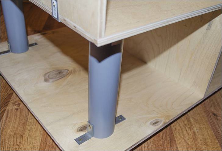 Канализационная труба разрезается на 4 части ‒ 2 по 22 см и еще 2 по 27 см. Более короткие отрезки будут использованы как подпорки под частью «Б», а более длинные будем использовать в качестве подпорки под часть «В». К основанию они крепятся с помощью уголков.