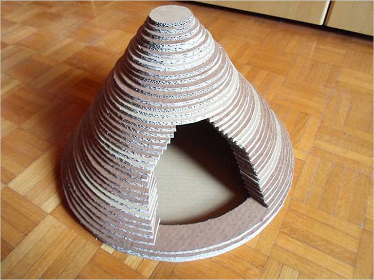 Остановимся на изготовлении более простой конструкции. Для сборки такого домика понадобится упаковочный картон толщиной 6 мм. Можно использовать и более тонкий картон, только потребуется найти или приобрести большее количество листов, и придется пересчитывать под него диаметр колец.