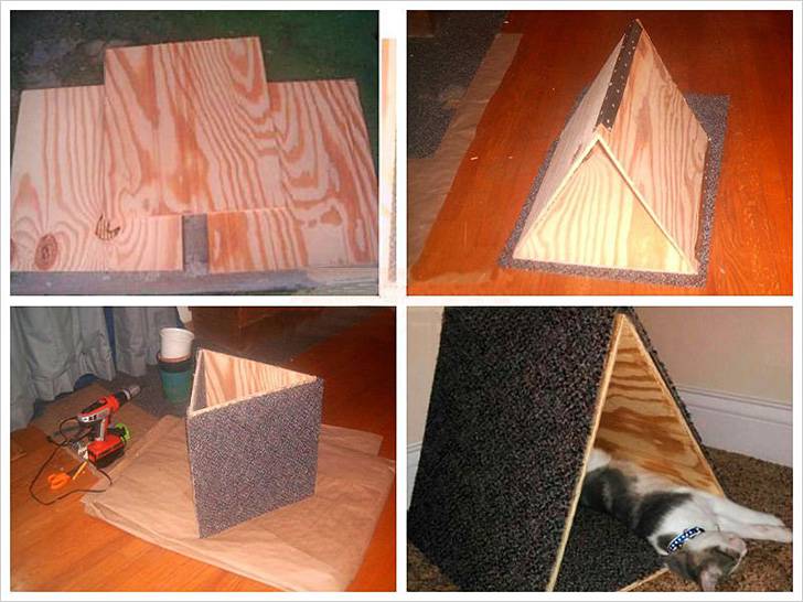 Для дополнительного утепления, стены можно внутри оббить ковролином, но при этом сложность будет заключаться в уборке такого жилища. Ковролином лучше оббивать наружную часть домика, что даст возможность не только спать коту в уютном и красивом жилище, но еще и точить когти о крышу и стены такого сооружения.
